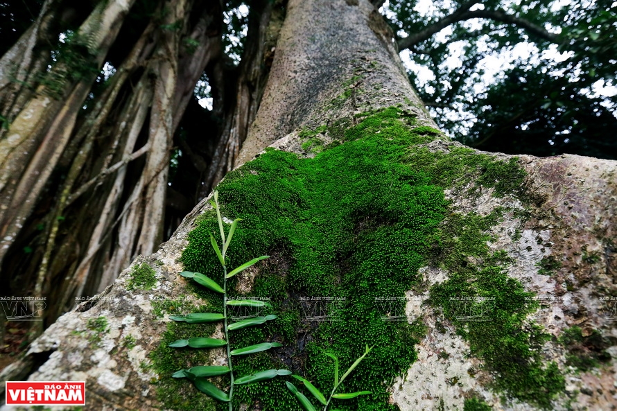 Tán cây đa lớn, dày che ánh sáng khiến thực vật mọc dưới sân phát triển quanh năm tạo thành thảm.